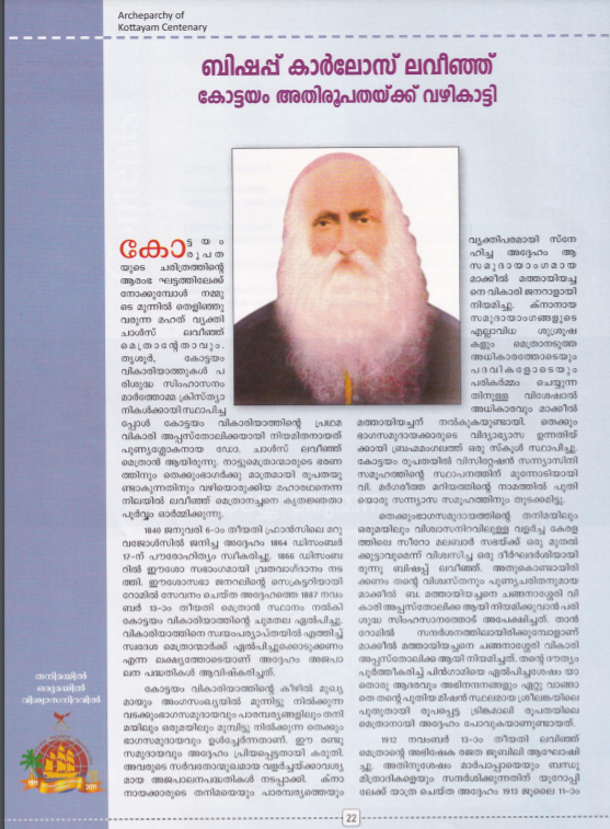Article on Bishop Carlos Lavinge by Rev. Dr. Thomas Kottoor published in the Centenary Souvenir of the Archeparchy of Kottayam.