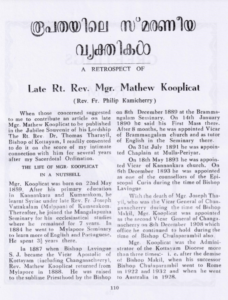 Biography of Msgr. Mathew Kooplicat published in the Episcopal Silver Jubilee Souvenir of Mar Thomas Tharayil as part of prominent persons of the Kottayam Diocese.