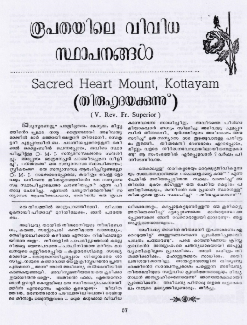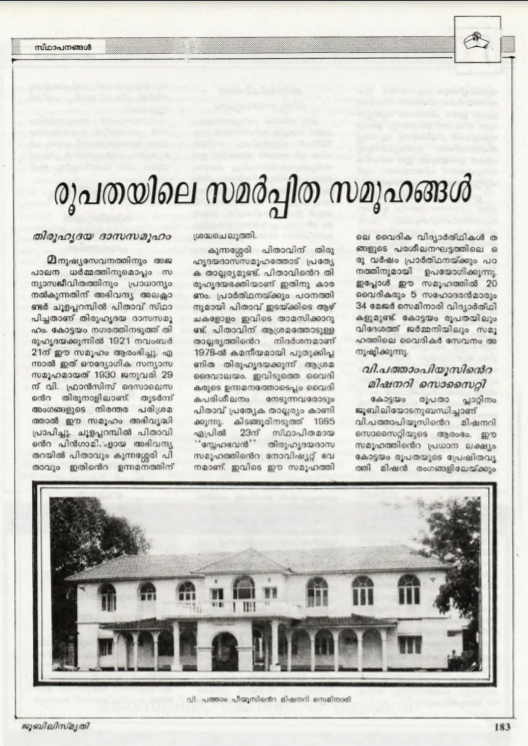 Details of the Religious Congregations of the Diocese of Kottayam (Oblates of the Sacred Heart of Jesus, Missionary Society of St. Pius X, Visitation Congregation, St. Joseph's Congregation, Caritas Secular Institute, and Little Daughters of St. John Gualbert) published in the Platinum Jubilee Souvenir of the diocese in 1986. Explore Back